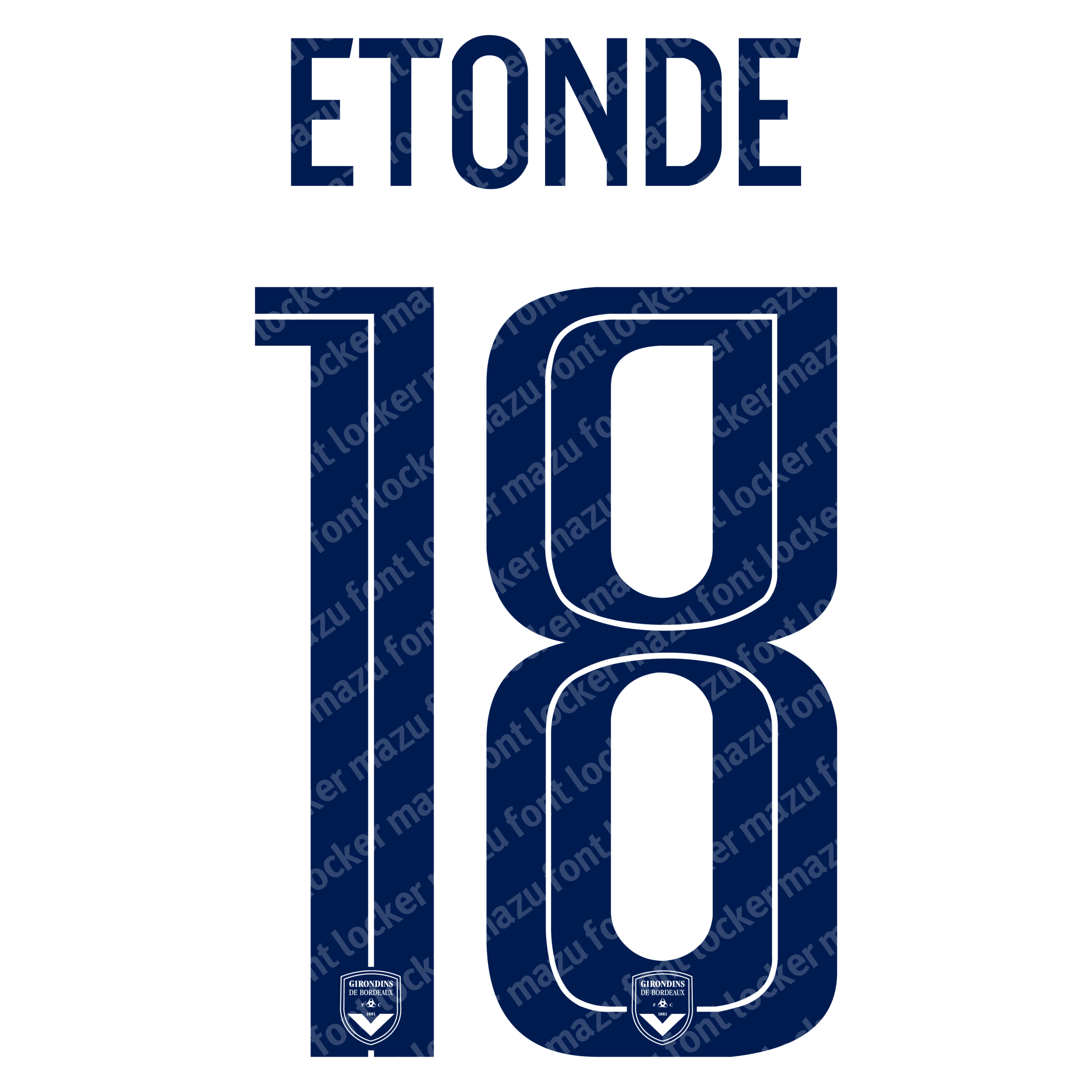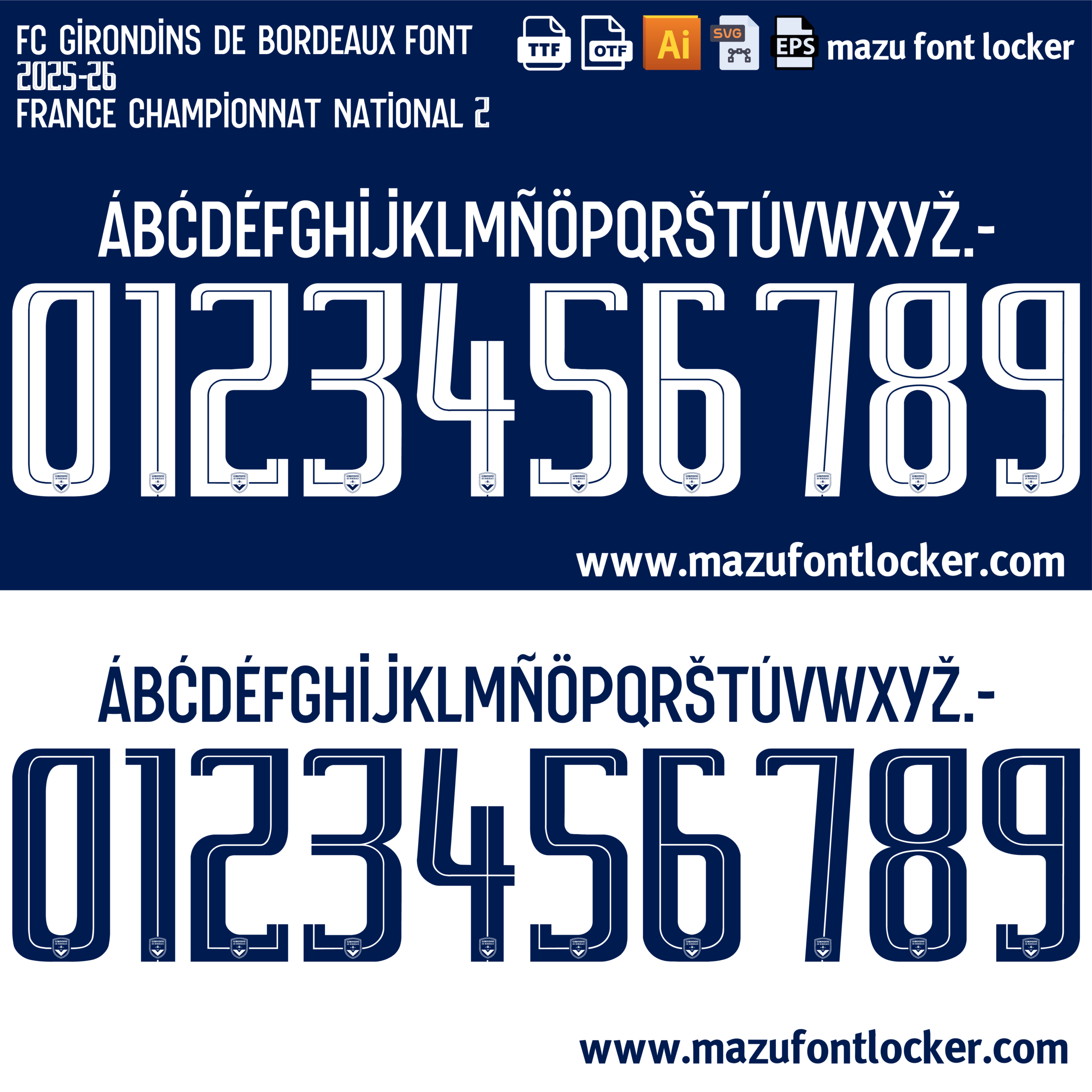 FC Girondins de Bordeaux 2025-26 font, names and numbers, fully editable VECTOR file for customisation.