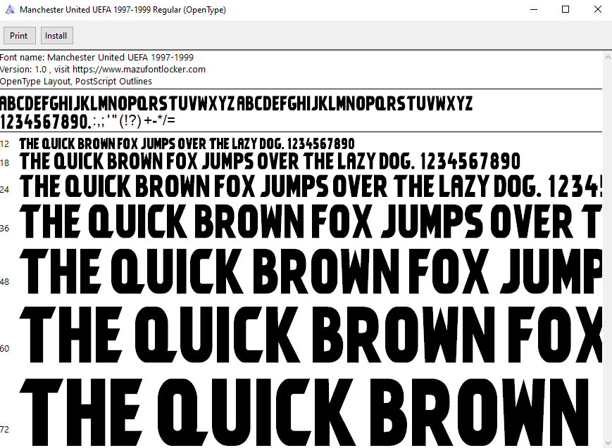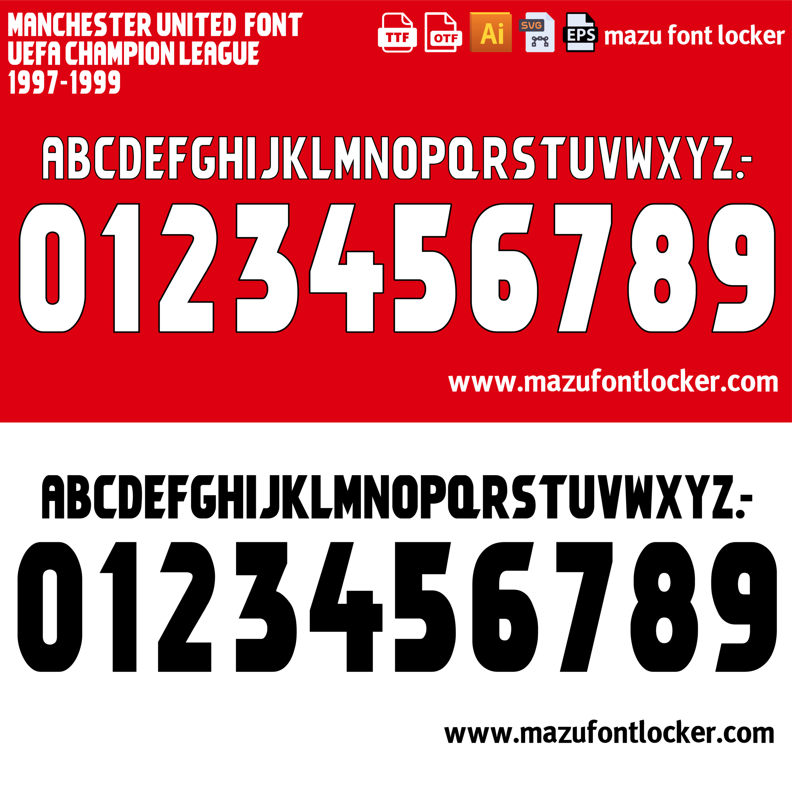 Manchester United UEFA 1997-1999 font, names and numbers, fully editable VECTOR file for customisation.