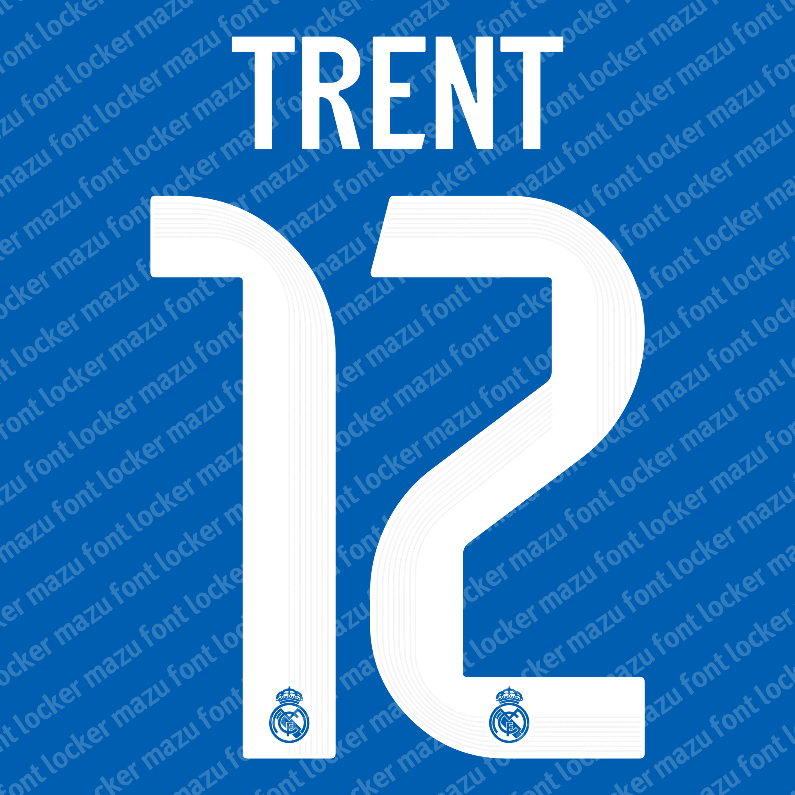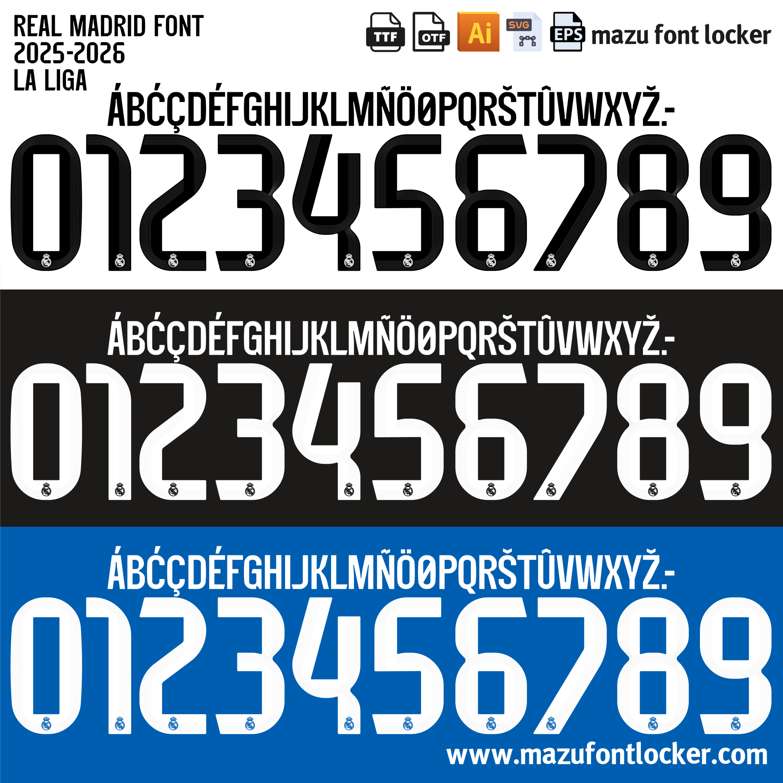 Real Madrid 2025-26 font, names and numbers, fully editable VECTOR file for customisation.