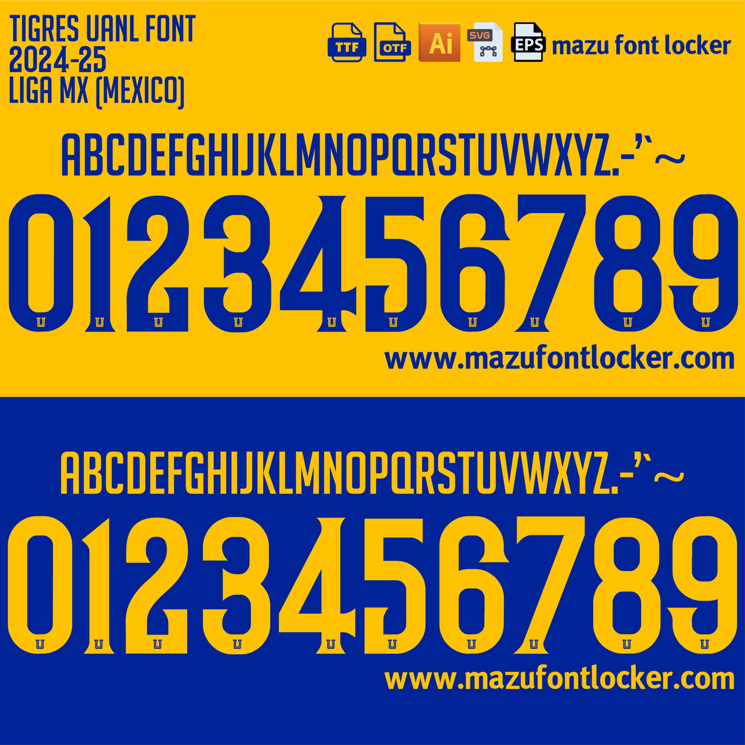Tigres UANL 2024-25 font, names and numbers, fully editable VECTOR file for customisation.